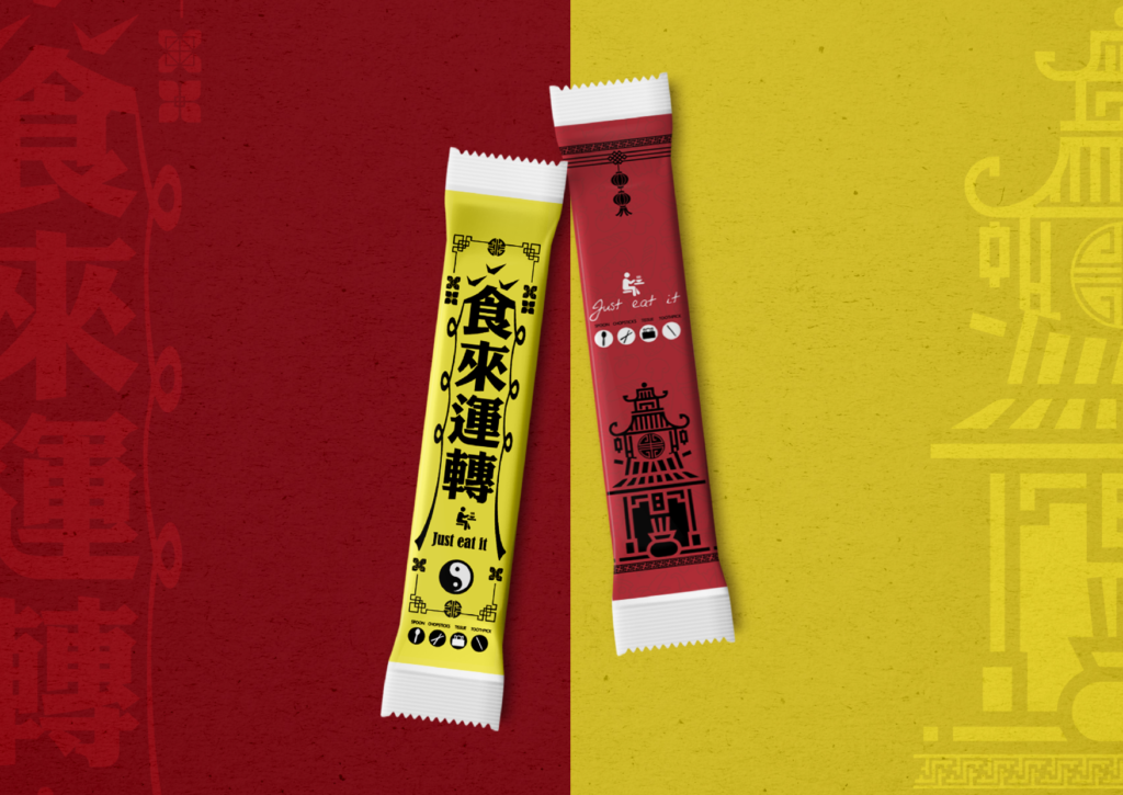 為位於台中的餐具包裝工廠進行環保筷套包裝設計,此次是專門為廟會平安餐具設計的包裝,兩款設計皆運用傳統信仰不可缺少的符咒元素,把祝福話語「食來運轉」代替符咒文字,兩款包裝設計成功打造傳統信仰氛圍,也走進年輕族群,讓包裝不再是一拆即丟的物品,更可以是有意義的收藏品。
